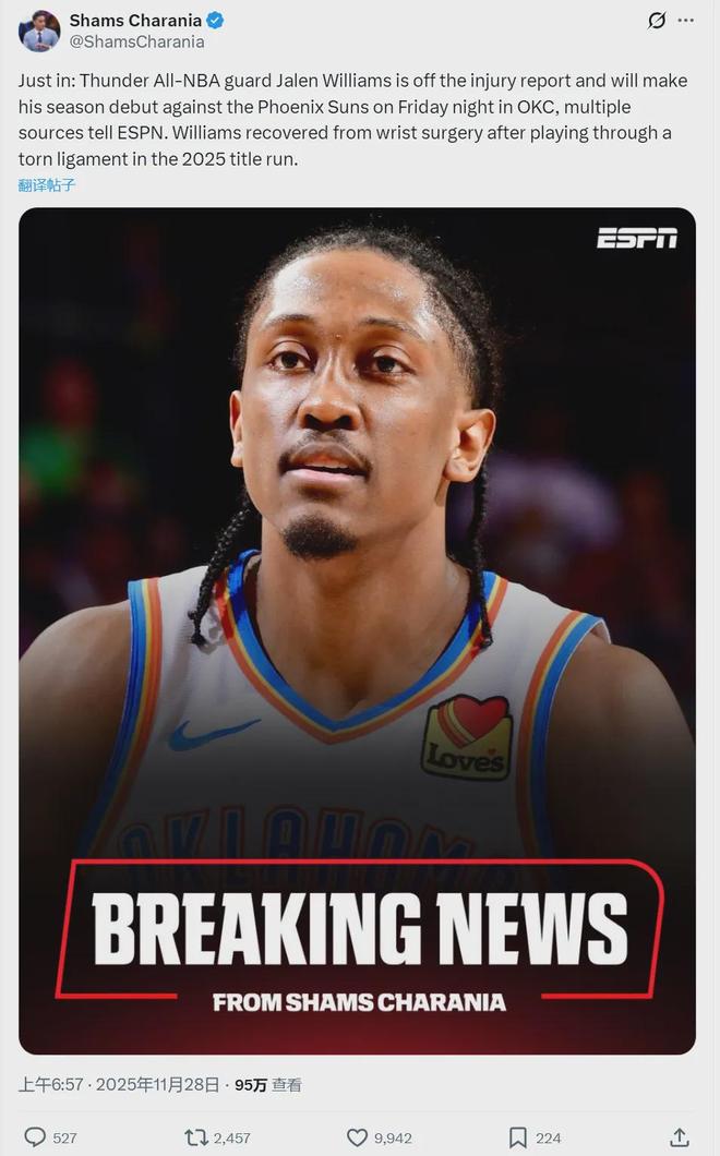 北京時(shí)間11月28日上午7點(diǎn),據(jù)NBA名記Shams報(bào)道,雷霆二當(dāng)家杰倫-威廉姆斯正式復(fù)出,他將在明日對(duì)陣太陽(yáng)迎來(lái)賽季首秀。今年休賽期,杰威因右手腕韌帶撕裂接受手術(shù),本賽季一場(chǎng)都沒(méi)打過(guò)。目前雷霆18勝1負(fù),高居聯(lián)盟第一!
